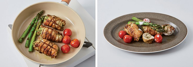 ⑥ 그릇에 구운 닭다릿살과 아스파라거스, 방울토마토를 올리고 요거트 소스를 곁들여 마무리한다.