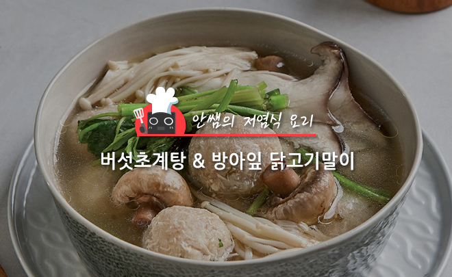 오늘 소개할 버섯초계탕와 방아잎 닭고기말이 요리의 건강비법을 보면, 버섯초계탕은 양파, 대파, 미나리가 들어간 육수로 자극적이지 않은 맛을 내었고, 방아잎 닭고기말이는 맛간장을 만들어 간을 맞추고 무가당 요거트를 이용해 첨가당 사용을 줄였습니다.