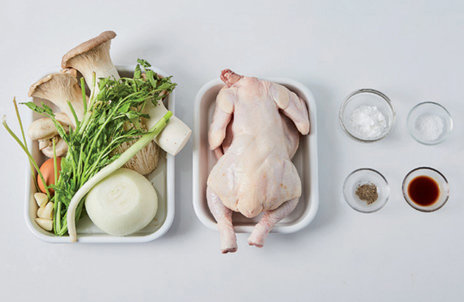 닭(1마리), 양파(1개), 대파(1대), 미나리(½줌), 새송이버섯(3개), 팽이버섯(1봉), 마늘(6쪽), 양송이버섯(4개), 달걀(1개), 전분(0.7Ts)