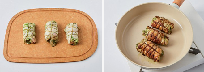 ④ 중간 불로 달군 팬에 식용유를 두르고, 돌돌 만 닭다릿살을 넣어 5분간 튀기듯 굽는다.