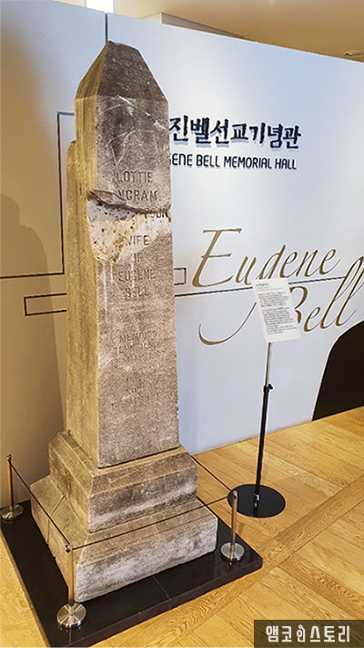 기념관 1층을 들어서자 로비로 <로티벨 묘비석>이 보입니다. 유진벨 선교사의 첫 번째 부인인 로티 위더스푼 벨(1867~1901)의 묘비석인데요, 양화진 외국인 선교사 묘역에 세워진 것을 그녀의 외증손인 린튼가의 인요한(John Linton)이 기증했다고 해요. 1894년 유진벨 목사와 결혼 후 1895년 한국에 도착한 그녀는 남편과 함께 서울, 호남 등지에서 선교활동을 벌이다 1901년, 32세의 나이에 사인 불명으로 세상을 떠났다고 해요. 그간의 세월이 여실히 느껴지는 묘비는 특히 한국전쟁의 상흔을 오롯이 간직한 총탄 자국이 인상 깊습니다.