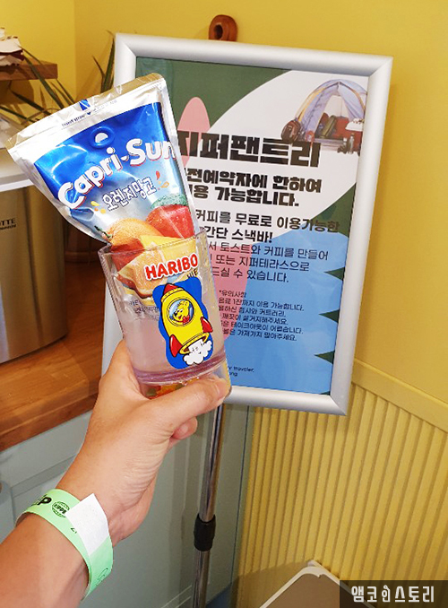 Zipper Family로 운영되는 2층 공간은 시설 이용부터 모든 프로그램 참여까지 사전 예약(홈페이지, 네이버)이 필요해요. 안내 데스크에서 예약을 확인하면 입장 팔찌를 받을 수 있는데요, 착용 후 당당하게 계단을 올라갑니다. 이곳은 지퍼 플래닛(Zipper Planet)과 지퍼 팬트리(Zipper Pantry), 지퍼 테라스(Zipper Terrace)로 조성되어 있어요. 동명동을 바라보며 쉬었다 갈 수 있는 캠핑 테라스가 인상적인 지퍼 테라스, 토스트와 커피, 음료가 무료로 제공되는 간단 스낵바가 있는 지퍼 팬트리는 간단히 허기를 달래기 좋아요. 이곳에서 가져온 토스트와 커피는 지퍼 플래닛 또는 지퍼 테라스로 가져가 먹을 수 있어요. 하리보 컵에 오렌지망고 카프리선을 담아 느낌 있게 고고합니다.