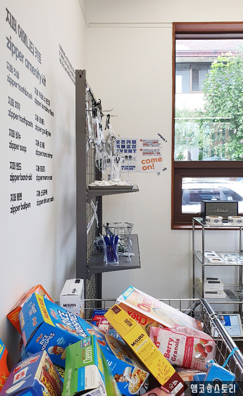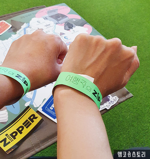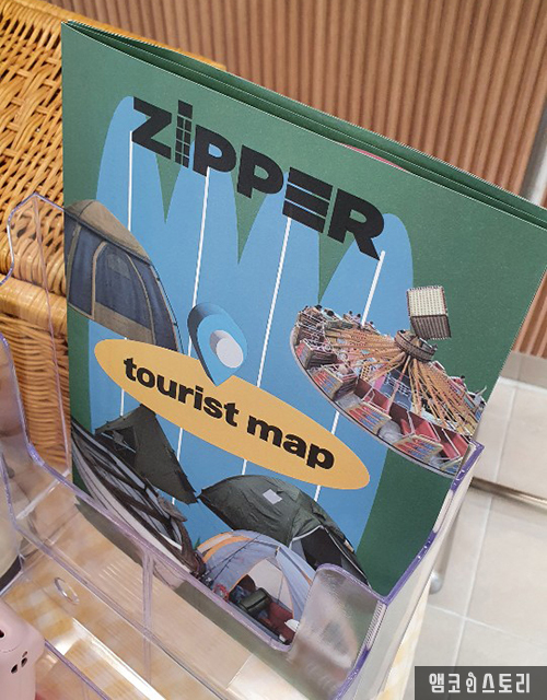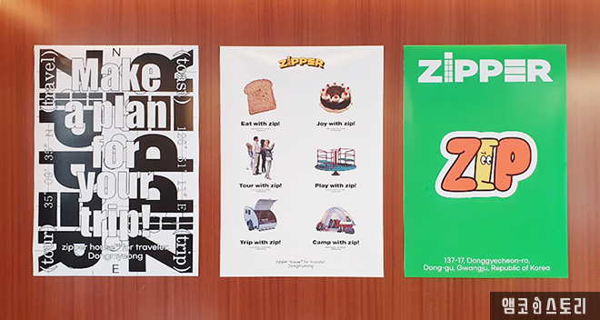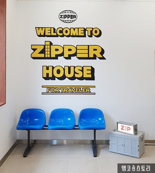 잔디 마당을 지나 1층 공간을 들어서자 안내 카운터가 보여요. 이곳의 상주 스텝이 친절한 안내와 함께 여행자의 zip 입장을 도와줍니다. 지하 1층에는 지퍼 포토존(Zipper Photo Zone, B1)이 위치하며 1층은 지퍼 라운지(Zipper Lounge)와 지퍼 샵(Zipper Shop)으로 운영되고 있어요. 지퍼 라운지에서는 여행지도 및 여행안내 외 짐보관, 프린트, 전자기기 충전 등의 편의 서비스를 제공받을 수 있습니다. 지퍼 샵에서는 지퍼 어메니티 키트, 지퍼 티셔츠를 비롯한 다양한 광주 기념품을 구매할 수 있어요. 통통 튀는 컬라 조합과 힙한 디자인이 절로 지갑을 열게 하는 기념품 샵입니다.