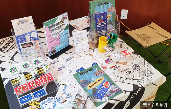 잔디 마당을 지나 1층 공간을 들어서자 안내 카운터가 보여요. 이곳의 상주 스텝이 친절한 안내와 함께 여행자의 zip 입장을 도와줍니다. 지하 1층에는 지퍼 포토존(Zipper Photo Zone, B1)이 위치하며 1층은 지퍼 라운지(Zipper Lounge)와 지퍼 샵(Zipper Shop)으로 운영되고 있어요. 지퍼 라운지에서는 여행지도 및 여행안내 외 짐보관, 프린트, 전자기기 충전 등의 편의 서비스를 제공받을 수 있습니다. 지퍼 샵에서는 지퍼 어메니티 키트, 지퍼 티셔츠를 비롯한 다양한 광주 기념품을 구매할 수 있어요. 통통 튀는 컬라 조합과 힙한 디자인이 절로 지갑을 열게 하는 기념품 샵입니다.