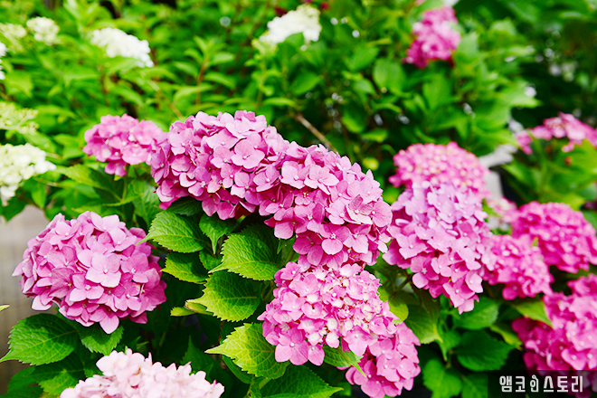 진한 향기와 색깔을 지닌, 장미의 계절이 지난 후 뜨거운 여름을 수수하게 장식하는 수국의 계절이 펼쳐졌습니다. 수국 종류별로 변덕, 진심, 처녀의 꿈 등 꽃말은 다양하지만, 마음을 차분하게 하는 매력은 동일한 것 같습니다.