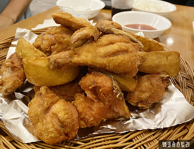 옛날 통닭같이 껍질이 얇고 아주 바삭한 치킨입니다. 기름기가 적고 담백한 느낌이라고나 할까요? 맥주랑 너무 잘 어울려요. 골뱅이 소면도 맛있다고 합니다.