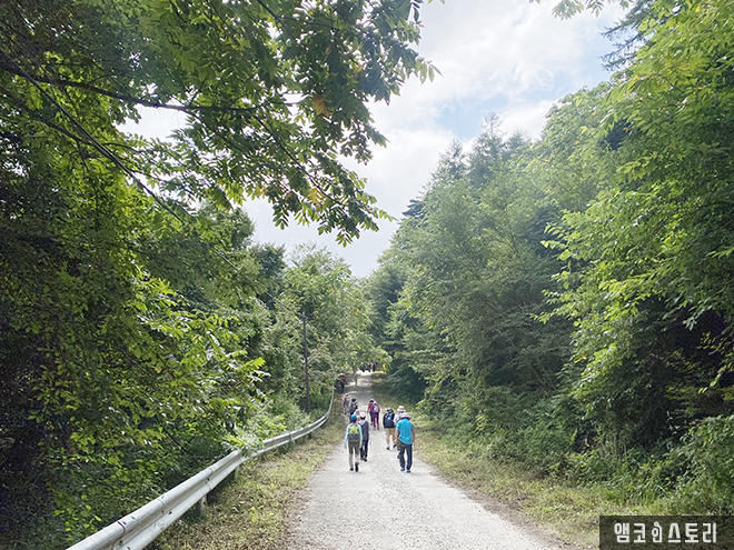 트레킹을 시작하며 방동약수부터 방동고개까지가 가장 가파른 임도를 오르게 되고, 그 다음부터는 하산길이 이어집니다. 임도길을 걷는 건 조금 지루할 수도 있지만 여기서 땀을 좀 흘려줘야 계곡에 들어가고 싶은 생각이 납니다. 8월 중순이지만 계곡물이 아주 차갑습니다.