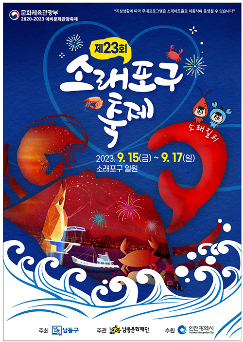 이어서 만나볼 축제는 추억과 낭만이 있는 <소래포구 축제>입니다. 2001년에 시작되어 올해로 23회를 맞는 본 행사는 수도권 대표 해양생태축제로 매년 40만 명 이상의 관광객이 방문할 정도로 인기가 많은데요, 올해는 9월15일(금)~17일(일) 사흘간 인천 남동구 소래포구 해오름광장 전통어시장 및 소래습지생태공원에서 개최된다고 해요. ‘소래바다’를 주제로 대하와 꽃게 잡기 등 각종 수산물 체험행사를 비롯해 다양한 문화공연, 이벤트는 친구, 가족과 함께 즐거운 추억을 쌓기에 더없이 좋을 것 같아요.