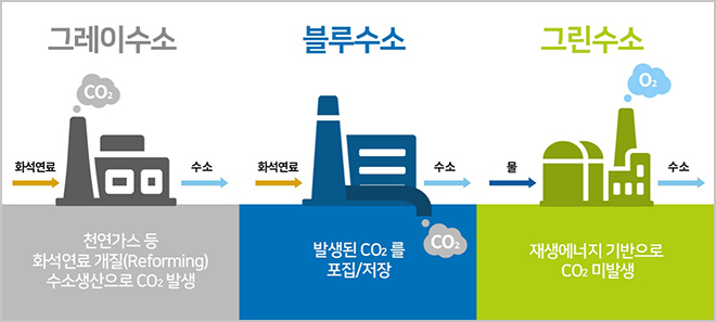현재 생산되는 대부분의 수소는 ‘그레이수소’에 해당됩니다. 천연가스를 고온 고압의 수증기와 반응시켜 수소를 얻어내는 방식이지요. 1대 10의 비율로 수소와 이산화탄소가 발생, 즉 1㎏의 수소가 생산될 때 10㎏의 이산화탄소가 발생하게 됩니다. 이산화탄소를 줄이기 위해 수소에너지를 사용하는 것이기에 분명 아쉬움이 있는 에너지입니다. 따라서 사용을 줄여야 할 에너지임에도 저렴한 비용으로 인해 여전히 많이 쓰이고 있는 상황이지요.