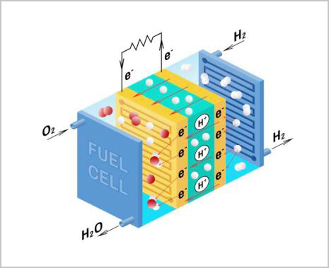 이렇게 만들어진 수소는 다시 연료전지를 통해 전기와 열에너지를 만들어내는 데에 활용되는데요, 연료전지는 물을 전기분해하여 수소를 생산해내는 과정의 역과정이라고 보시면 됩니다. 연료극에서는 수소를 수소 이온과 전자로 분해합니다. 전해질의 고분자막은 수소 이온만을 통과시키고 남은 전자는 막의 음극에 남아있게 됩니다. 통과한 수소 이온은 산소를 만나 물이 되는데요, 이때 발생한 양극과 음극 사이의 전위차로 분리된 전자가 흐르며 전류가 발생하게 되어 전기가 생산되는 것이지요.