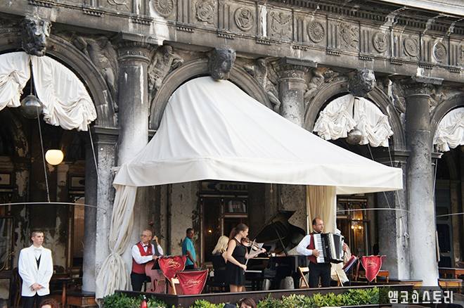 (지난 호에서 계속됩니다) 엘리베이터를 타고 내려와 다시 광장으로 나왔다. 어느 레스토랑 앞에서는 연주를 하고 있는데 딱 봐도 유서 깊은 베네치아의 맛집처럼 보인다.