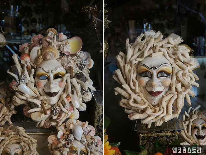 숙소로 가던 길에 우연히 발견한 가면 가게다. 정말 소름 끼칠 정도로 정교하게 만들어 놓은 가면들을 걸어 놓았는데, 산호와 조개 껍데기로 만들어 놓은 가면들이 특히 눈에 띈다.