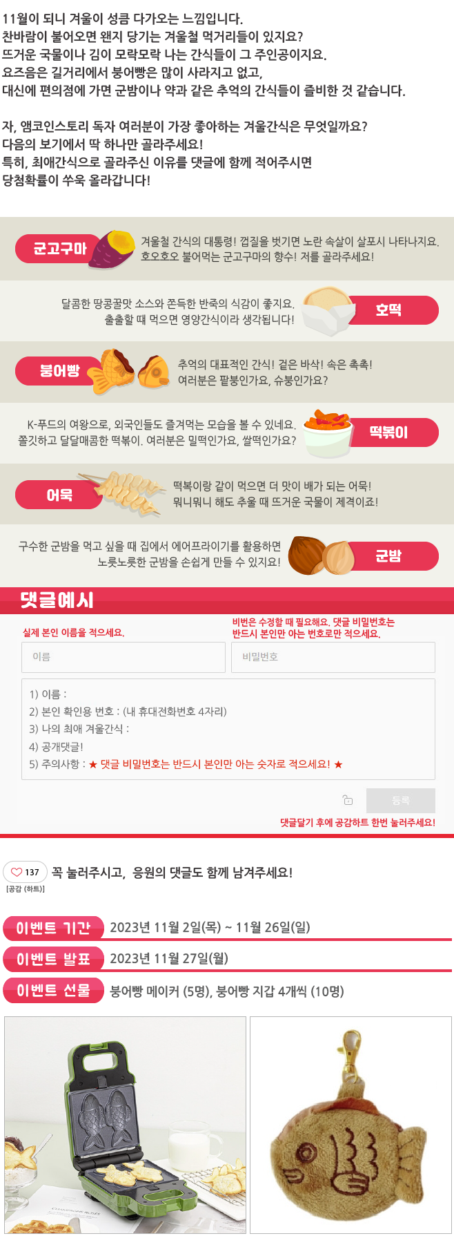 | 나의 최애 겨울간식은? 이벤트 결과 발표_웹진 [앰코인스토리] (0) | 2023.11.27 |