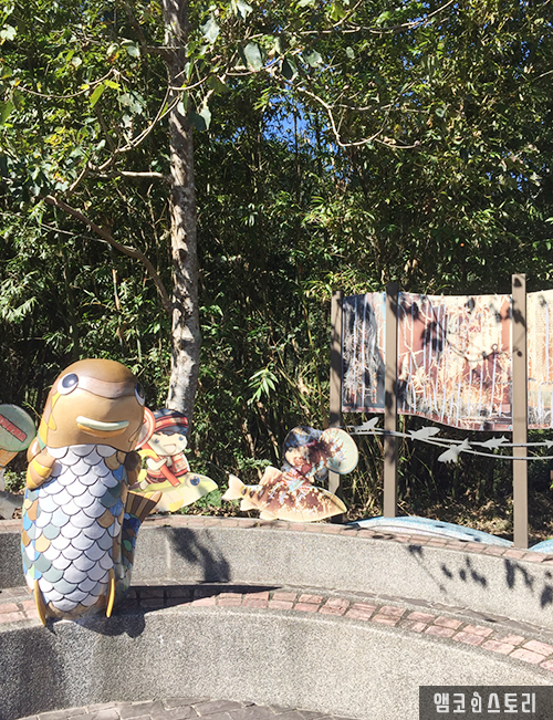 그래서인지 공원 입구에 도착하면 여러 물고기 모양의 조각을 볼 수 있습니다. 입구를 통해 생태공원에 진입하면 시원한 풍경이 펼쳐집니다. 오른쪽에는 개울이 흐르고 왼쪽에는 많은 나무들이 있어 탐방로를 따라 산책하기 아주 좋습니다.