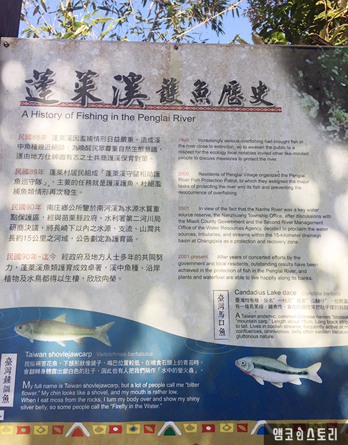 개인적으로 대만의 좋은 점 중 하나가 초록색을 많이 볼 수 있다는 점인데요, 오늘 소개드릴 곳 역시 자연의 초록색을 마음 것 즐길 수 있는 미야오리(苗栗) 난좡(南庄) 생태공원입니다. 미야오리는 타이베이에서 차로 한 시간 반 정도 떨어진 곳에 있습니다. 미야오리 동쪽에 있는 난좡 생태공원은 2013년 태풍이 강타하면서 생태로가 많이 손상되었다가 주민들의 노력으로 다시 조성되었답니다. 특히, 난좡을 따라 흐르는 봉래천은 어류 보호 활동을 실시하여 개울을 성공적으로 복원한 사례로 잘 알려져 있기도 합니다.