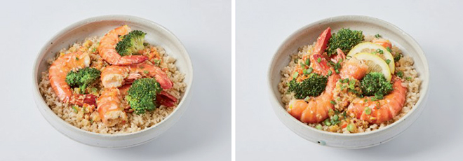 ⑤ 그릇에 현미밥을 담고, 볶은 블랙타이거 새우와 국물을 골고루 뿌린다.