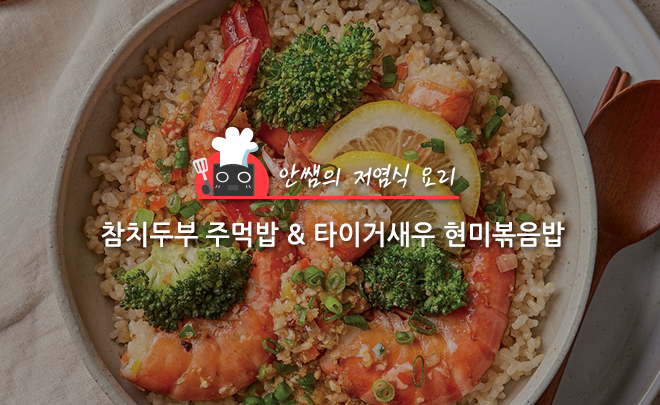 오늘 소개할 요리의 건강비법을 보면, 참치두부 주먹밥은 통조림 참치 등 사용 시 뜨거운 물을 부어 나트륨 섭취를 줄였습니다. 타이거새우 현미볶음밥은 백미보다 칼륨이 풍부한 현미밥을 사용했고 저염 버터로 나트륨 섭취량을 줄였습니다.
