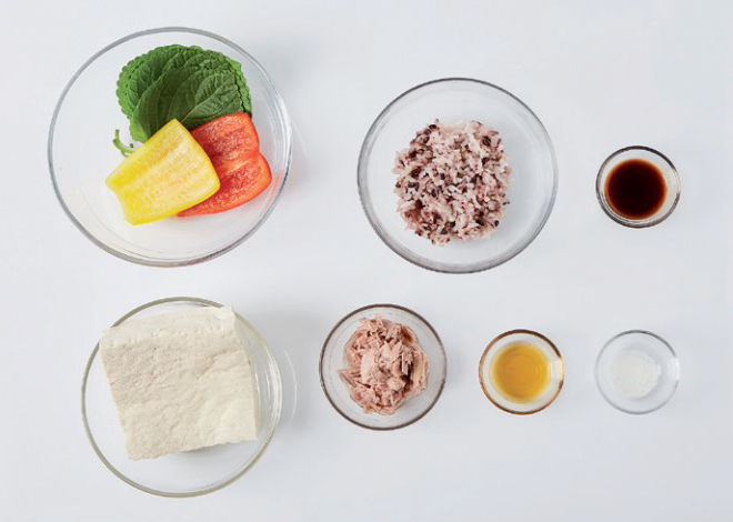 두부(1모=300g), 파프리카(빨강, 노랑 각 ¼개), 깻잎(4장), 잡곡밥(70g), 통조림 참치(50g)