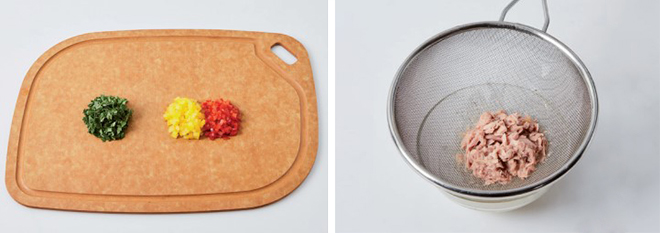 ④ 통조림 참치는 체에 밭친 뒤, 뜨거운 물을 부어 기름과 염분을 제거한다.