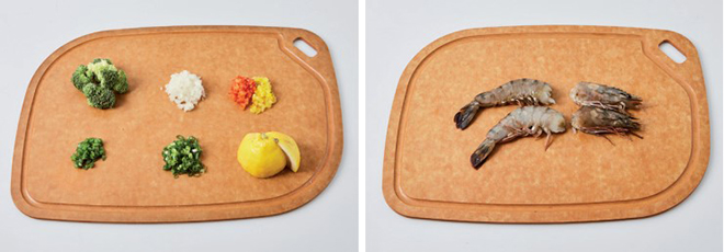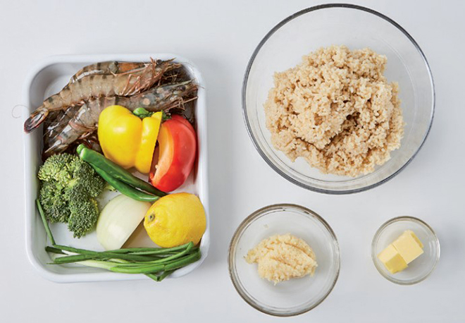 브로콜리(¼개), 양파(¼개), 파프리카(빨강, 노랑 각 ¼개), 쪽파(2대), 블랙타이거 새우(8마리), 현미밥(2공기)