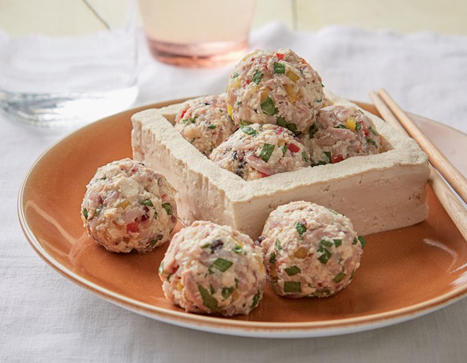 ⑤ 볼에 으깬 두부, 손질한 채소, 잡곡밥, 참치를 넣은 뒤 양념해 고루 섞는다.