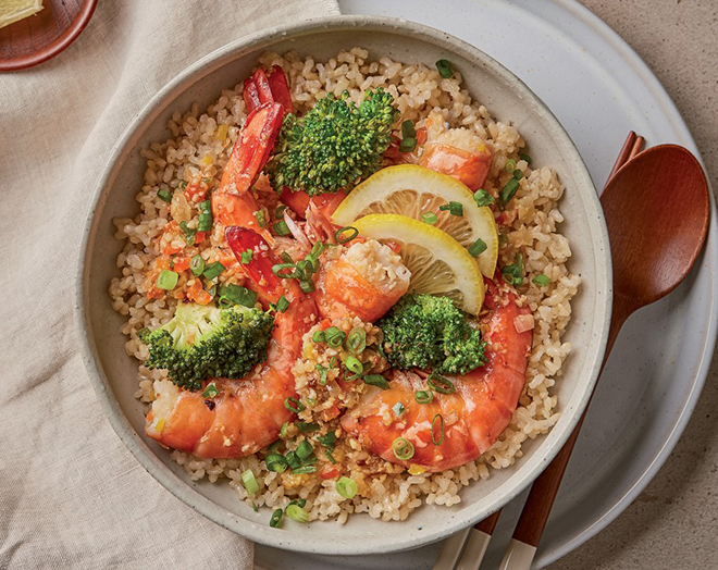 ⑤ 그릇에 현미밥을 담고, 볶은 블랙타이거 새우와 국물을 골고루 뿌린다.