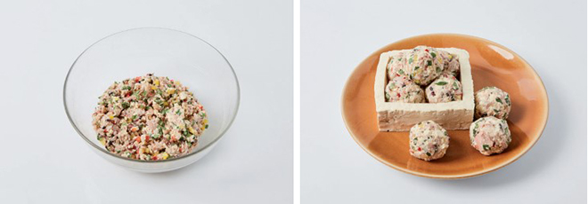 ⑤ 볼에 으깬 두부, 손질한 채소, 잡곡밥, 참치를 넣은 뒤 양념해 고루 섞는다.