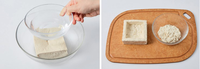 ① 큰 볼에 두부를 담은 뒤 물이 담긴 무거운 그릇을 3분간 올려 수분을 제거한다.
