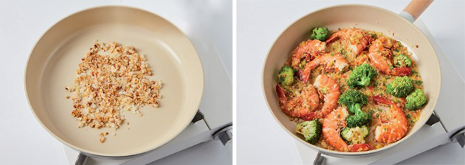 ④ 손질한 블랙타이거 새우와 버터를 넣은 뒤 새우의 색이 변할 때까지 볶고, 다진 파프리카, 청양고추, 브로콜리를 넣어 2분간 볶는다.
