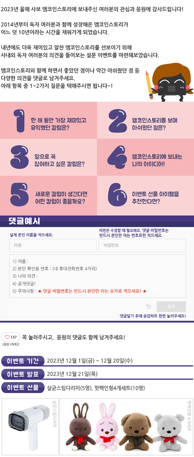 | 나의 최애 겨울간식은? 이벤트 결과 발표_웹진 [앰코인스토리] (0) | 2023.11.27 |