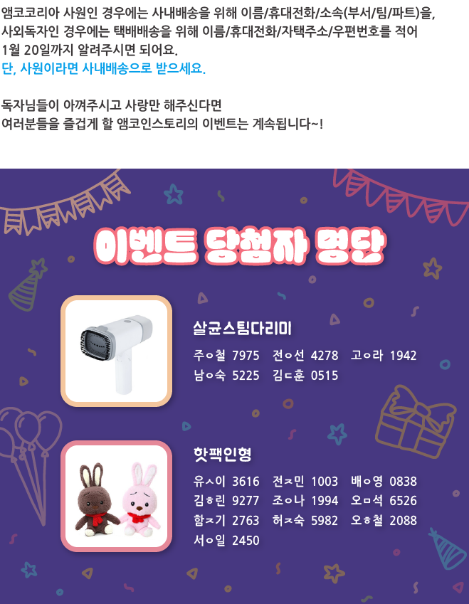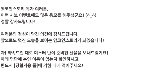 | 나의 최애 겨울간식은? 이벤트 결과 발표_웹진 [앰코인스토리] (0) | 2023.11.27 |