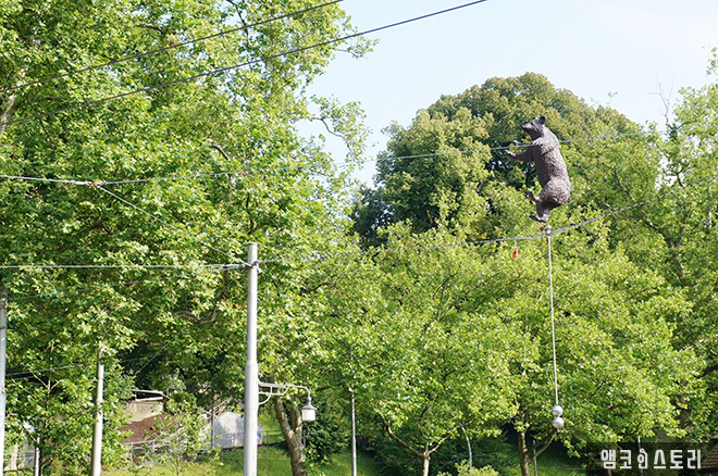 구시가지 전체가 유네스코 세계문화유산으로 지정돼 있다고 하는 베른. 곰의 도시답게 곰 동상도 많고 하늘에 떠있는 외줄 타기 곰도 인상 깊다. 아슬아슬 줄타기를 하는 곰인형처럼 보이지만, 아래에 달려있는 무게추가 중심을 잡아줘 바람이 불어도 쓰러지지 않을 것 같다.