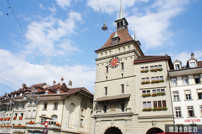 구시가지 전체가 유네스코 세계문화유산으로 지정돼 있다고 하는 베른. 곰의 도시답게 곰 동상도 많고 하늘에 떠있는 외줄 타기 곰도 인상 깊다. 아슬아슬 줄타기를 하는 곰인형처럼 보이지만, 아래에 달려있는 무게추가 중심을 잡아줘 바람이 불어도 쓰러지지 않을 것 같다.