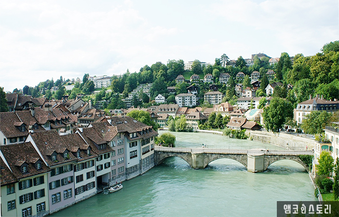 아름다운 시냇물을 예상했지만, 베른을 흐르는 물은 세찬 강물에 가깝다. 그림처럼 언덕에 늘어서 있는 예쁜 집들과 도시를 휘감아 흐르는 강물이 멋진 조화를 이룬다.