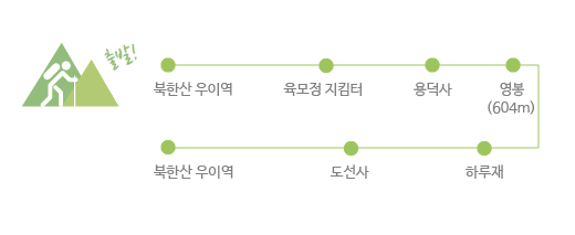 북한산 영봉 코스는 길이는 짧지만 아름답고 사방이 트인 시원한 경치를 감상할 수 있고, 비교적 사람이 적은 길이라 육모정 지킴 터 → 영봉 → 하루재까지는 여유 있는 등산을 할 수 있습니다. 어렵지 않게 산행 코스로 도봉산의 오봉부터 자운봉까지의 능선과 함께 멋진 사진도 담을 수 있는 곳입니다.