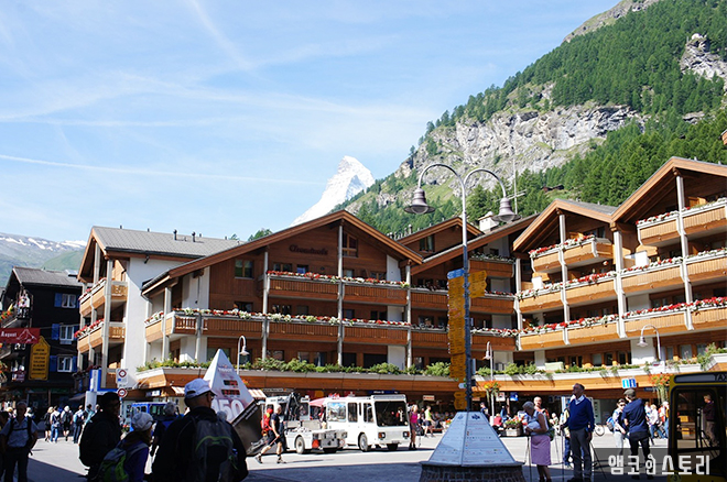 역에서 나와 건물 사이를 걷는데 저 멀리 뾰족한 것이 보인다. 앗, 저것은! 맞다. 바로 마터호른 봉우리다.