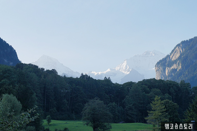아침에 서둘러 숙소를 나오는데 저 멀리 만년설이 보인다. 이곳이 바로 스위스구나 실감하는 순간이다.