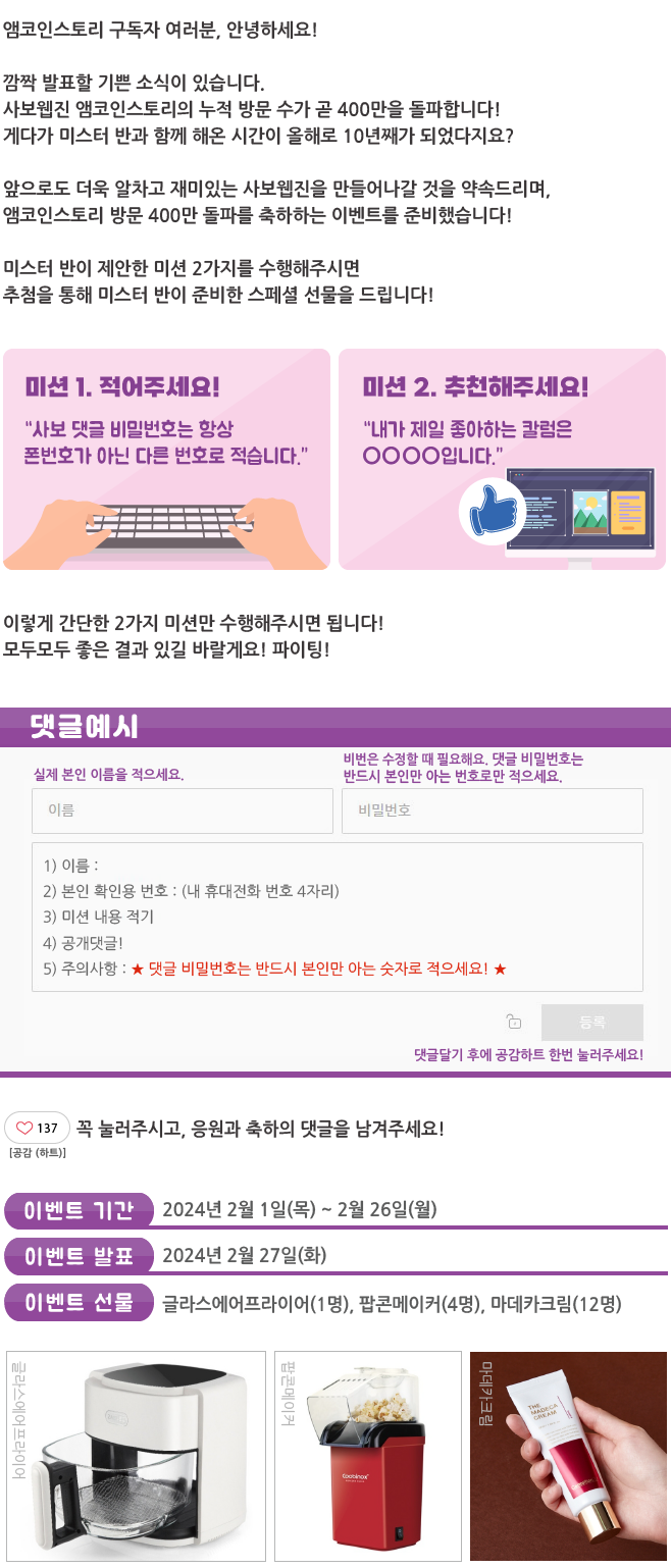 | 방문 400만 돌파 이벤트 결과 발표_웹진 [앰코인스토리] (0) | 2024.02.27 |
