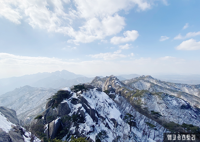 정상 부근에 도착하면 신선대, 자운봉, 만장봉, 선인봉의 압도적인 거대한 암릉에 심장이 두근두근 아드레날린이 샘솟는 것 같아요. 도봉산의 능선은 조망도 좋고 길도 가파르지 않아서 경치도 즐기며 걷기 좋습니다. 특히 눈 덮인 길은 밟는 느낌도 좋고, 눈이 덮인 암릉들의 경관이 더 웅장하고 멋진 것 같습니다.
