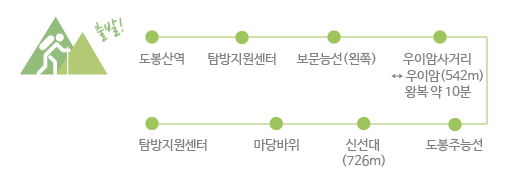 도봉산이라는 지명은 여러 봉우리들이 마치 길을 가듯, 일정한 방향으로 늘어서 있어 붙은 이름이라고도 하는데요, 이름 그대로 ‘봉우리가 길인 산’이라고 합니다. 우람한 기암괴석과 높이 솟은 바위 봉우리들의 경관이 멋진 곳인데, 자운봉, 만장봉, 선인봉, 주봉, 우이암과 서쪽으로 다섯 개의 암봉(오봉)까지 아름다운 경치 즐기기 좋은 코스를 소개합니다.