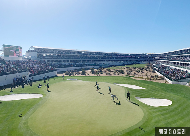 이중에 가장 인기있는 홀(hole)은 16번 홀로써, 사방에 20,000석 규모의 임시 스탠드를 세워 콜로세움 형식으로 만들어 선수들의 경기를 앉아서 술을 마시면서 볼 수 있게 만들어 놓았습니다. 물론 이곳은 입장권을 따로 구입해야 하고 그 비용도 너무 비싸기 때문에 쉽게 갈 수 있는 곳은 아닙니다. 대부분이 기업 후원으로 입장권이 판매가 되어 홍보 수단으로 사용하고 있습니다. 간단한 음식과 다양한 주류가 무료이기 때문에 미국의 전형적인 스포츠 관람방식인 바(Bar) 문화와 즉흥적인 응원문화가 곁들어진 장소인 것 같습니다. 대회 기간 중 어느 날은 관중들의 무 매너와 과도한 음주로 인해 한때 입장객을 받지 않았던 날이 있을 정도로 광란의 축제라고 해도 과언이 아닐 듯합니다.