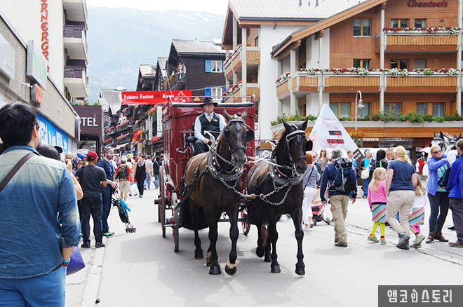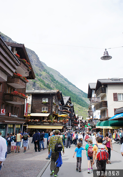 산악열차를 타고 다시 체르마트로 내려왔다. 오후 3시 30분이다. 기차 시간이 좀 여유가 있어 마을을 둘러본다. 정말 많은 관광객으로 넘쳐나는 체르마트. 겨울에는 스키 타러 많은 관광객들이 몰린다고 하는데, 스키를 타며 바라보는 마터호른의 모습도 정말 멋질 것 같다.