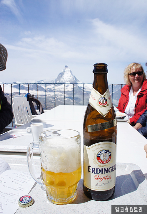 전망대에는 야외 카페가 있는데 많은 관광객들이 테이블에 앉아있다. 우리 가족도 마터호른이 잘 보이는 테이블에 앉고, 필자는 에딩거 맥주를 시켜본다. 경치가 좋아 안주가 따로 필요 없는 곳이다.