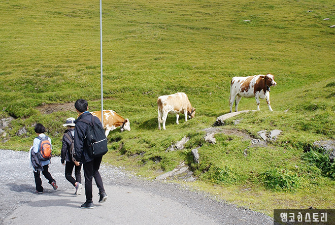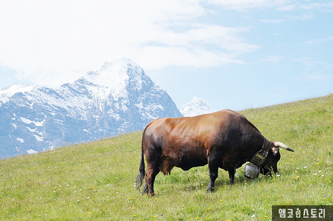 풀밭에는 자유 방목을 해서 키우는 소들이 있는데, 누구 하나의 간섭도 받지 않고 평화롭게 풀을 뜯고 있는 모습이 멋지다. 헌데, 소의 목에 걸린 방울이 참 크다. 소몰이꾼이 방울소리로 소를 찾기 위해 큰 방울을 달아 놨으리라.
