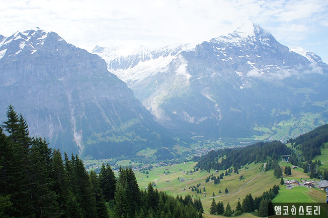 곤돌라를 타고 피르스트로 간다. 만년설에 덮인 깎아지른듯한 험준한 산과, 그 아래 펼쳐진 초록색 풀밭을 보니 이곳이 바로 알프스임을 느끼게 된다.