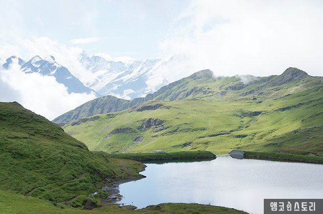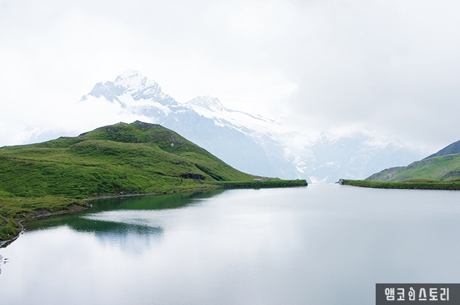 바람이 멈춰 거울 같은 호수에 비친 알프스의 모습을 기다려 보지만, 아쉽게도 이제 피르스트로 돌아가야 할 시간이다. (다음 호에서 계속됩니다)