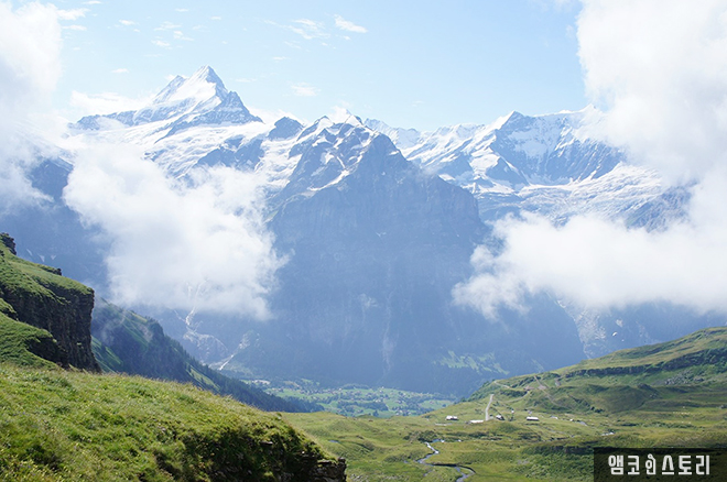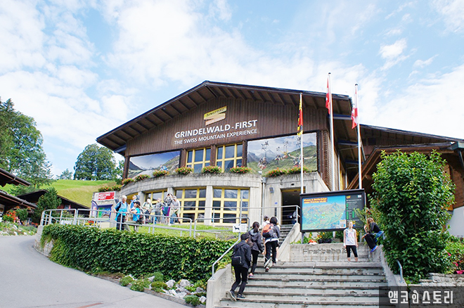 곤돌라를 타고 피르스트로 간다. 만년설에 덮인 깎아지른듯한 험준한 산과, 그 아래 펼쳐진 초록색 풀밭을 보니 이곳이 바로 알프스임을 느끼게 된다.