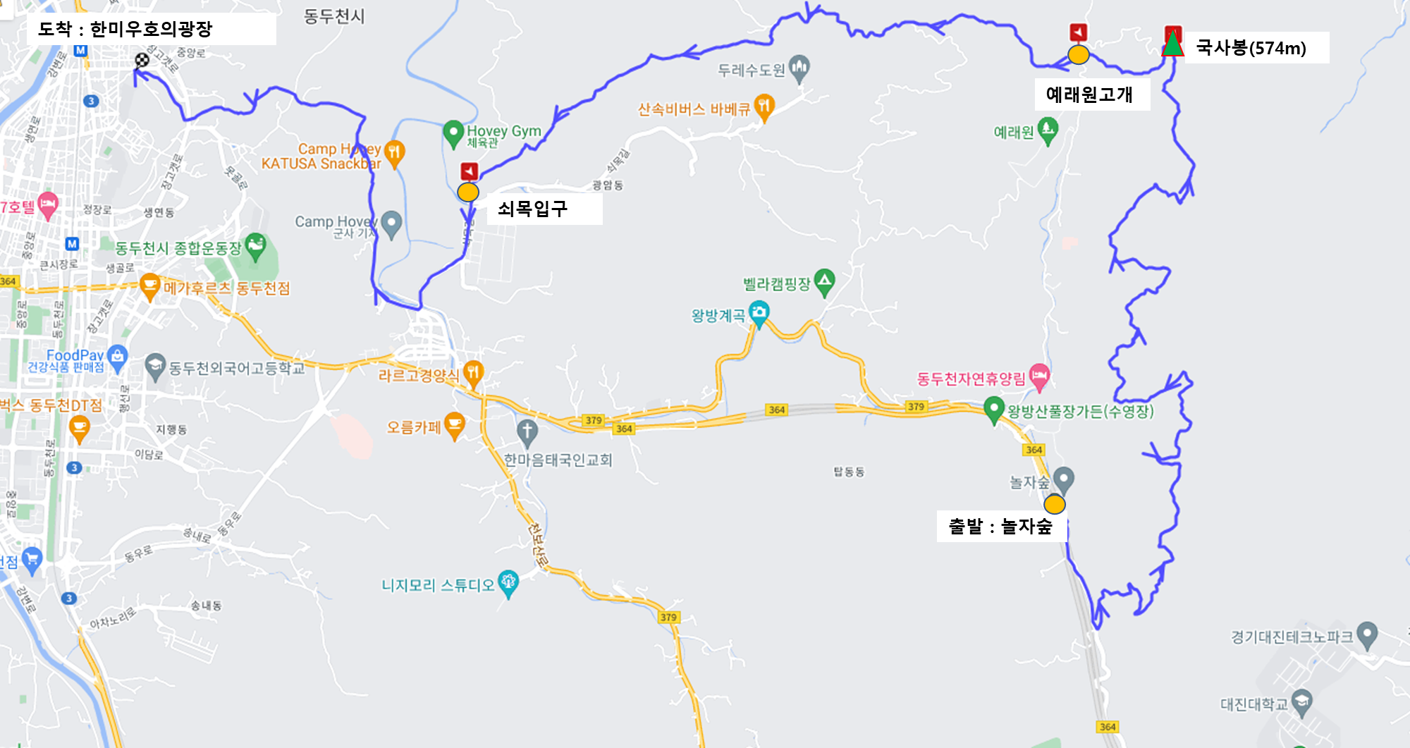 22K는 경기도 동두천과 포천 일대에서 이루어지는 코스들로, 동두천과 왕방산 국사봉 구간이 이어지게 됩니다. 국사봉은 574m 정도이지만, 총 코스의 누적 고도가 약 1,100m 정도이고, 22km를 6시간 안에 완주해야 하기 때문에 쉽지는 않지만, 코스 자체가 어렵지 않았고 러닝하기에 좋은 길이었습니다.