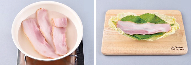 ① 베이컨은 뜨거운 물에 살짝 데친다.