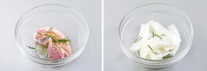 ② 양파는 먹기 좋게 썰어 식초, 설탕, 로즈마리에 살짝 버무린다.